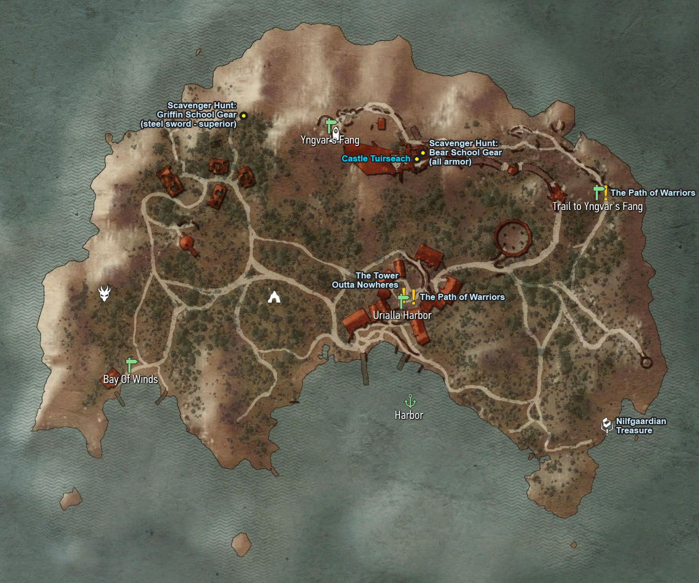 Hlavním sídlem ostrova je přístav a vesnice Urialla, nad níž se na hoře Aardeklove nachází hrad Tuirseach, dříve sídlo klanu. Hoře se také podle bájného medvěda, kterého podle legendy porazil Tyr, hrdinný zakladatel klanu Tuirsearch, říká Yngvarův kel a je pýchou a chloubou ostrova, na kterou musí každý muž, pokud se chce stát uznávaným bojovníkem, v rámci zkoušky vyšplhat.