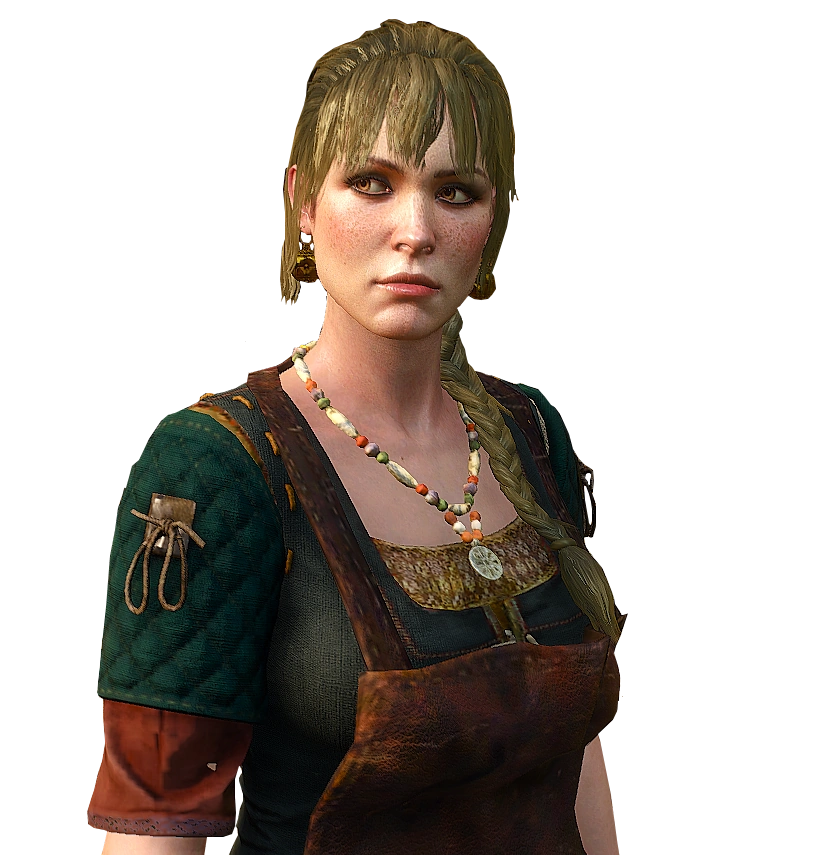 Žena se zvláštním přízvukem po krátkém rozhovoru prozradí, že je Skelližanka. Pochází z Undviku a vyrůstala v Holmsteinu. V 17 letech ji otec, kovář, vyslal do světa s tím, že jí nemá už co víc naučit. Po několika letech se stala mistryní řemesla a válka ji zavedla právě na Vranohrad. Tváří se, že je pouze pomocnicí a Fergus je zbrojařským mistrem, ačkoli ve skutečnosti je tomu naopak, protože mnozí nejsou schopni uvěřit, že by žena byla schopna vyrobit mistrovskou zbroj. Pokud jí Geralt v rámci úkolu „Mistři zbrojířští“ pomůže, vyjde pravda najevo a Geralt získá přístup k výrobě mistrovských zaklínačských zbrojí.